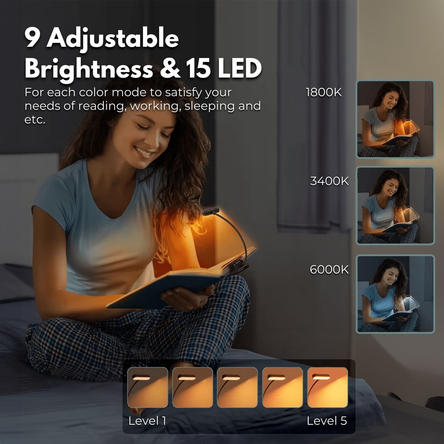 - 9 Adjustable Brightness & 15 LEDs: Comes with 3 colors and 3 brightness settings, designed with 15 LED bulbs to adjust Low / Medium / High brightness for each color mode to satisfy your needs of reading, working, sleeping and etc.