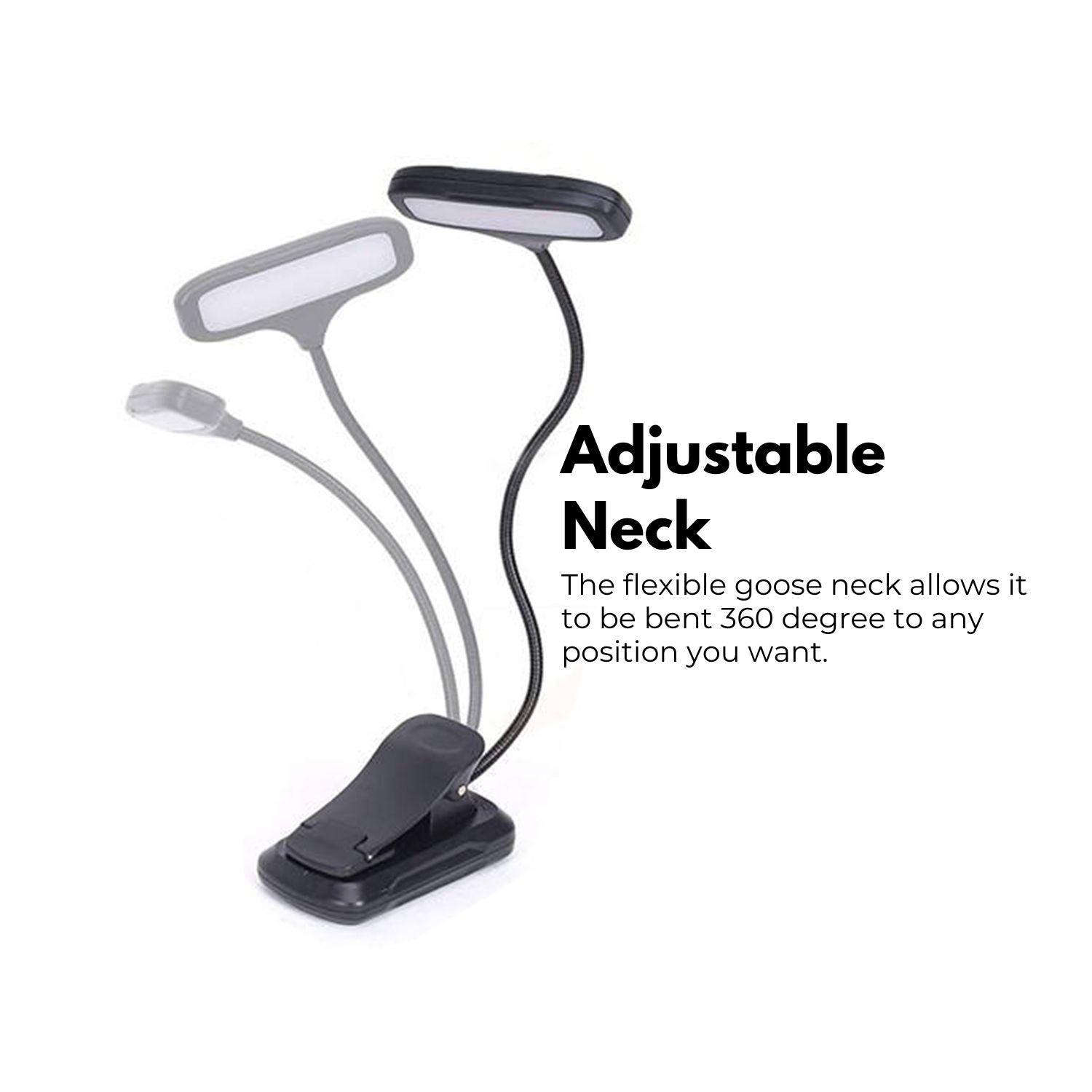 - Adjustable Neck & Clip Pad: The flexible gooseneck allows it to be bent 360 degrees to any position you want, and its lightweight size and compact design makes it easy to carry even while traveling. The sturdy clip pad can stand on its own or firmly clamp an e-reader, book, shelf and etc.